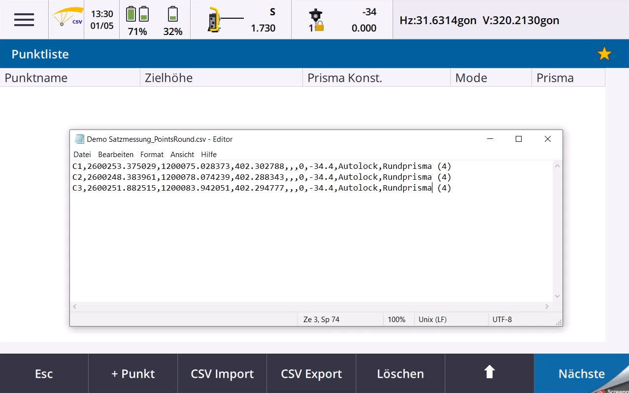 Mit dem von ALLNAV entwickelten Trimble Access-Modul Rounds können Anwender schnell und bequem Satzlisten als Koordinaten-Datei, einschliesslich der Zielinformationen und der Messmethode, speichern und laden. Dies ermöglicht Satzmessungen schneller und effizienter durchzuführen und die Beurteilung der Messungen direkt im Feld vorzunehmen.